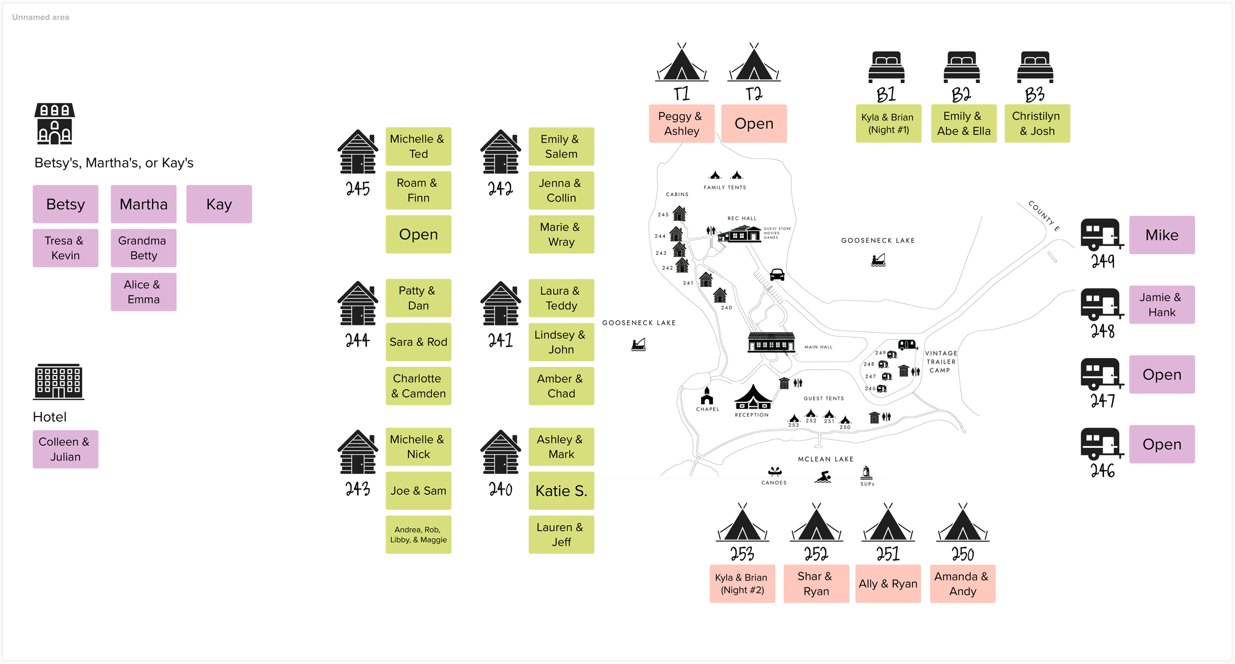 Below is a list of guests who’ve RSVPed “yes” and where they’ll be staying, in case you feel like wandering over to share a drink, for an impromptu hello, or a porch chat.